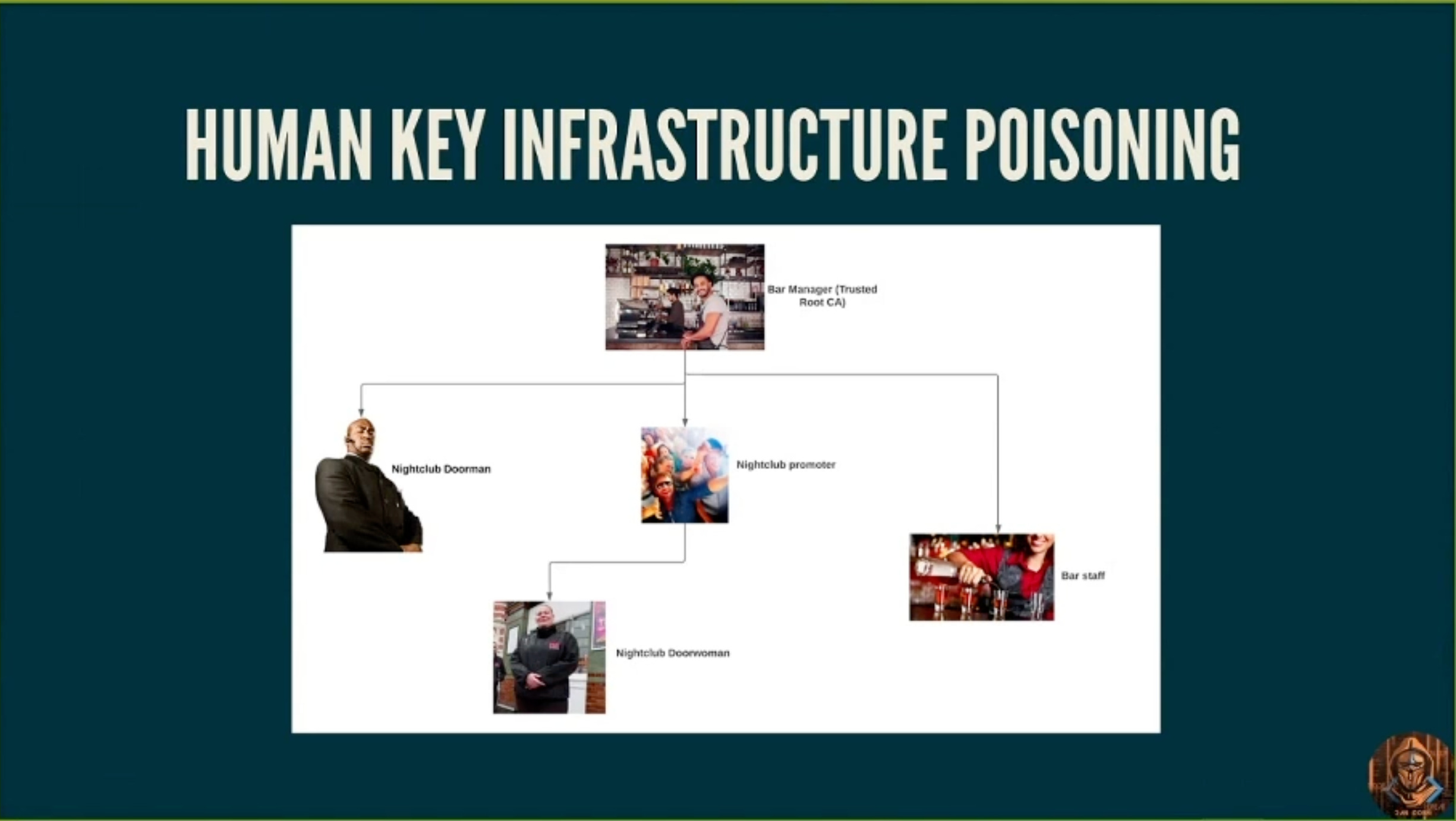 One thing that interested me when learning about social engineering was how you need to build trust in order to attack. I thought that if you think about chains of trust in humans, it’s a bit like how certificates are trusted in Public Key Infrastructure (PKI). If you poison a Root Certificate Authority (CA), then other CAs will accept the poisoned certificate which can lead to things that should not be trusted, to being so. Let’s consider that humans also have this tree of trust, a Human Key Infrastructure (HKI), perhaps. By using social engineering techniques, you can poison this HKI too meaning that you are trusted to do things that you shouldn’t be. In this example it’s being let into nightclubs underage, and getting to DJ at them. But it could also be someone in a business wishing to undertake corporate espionage.